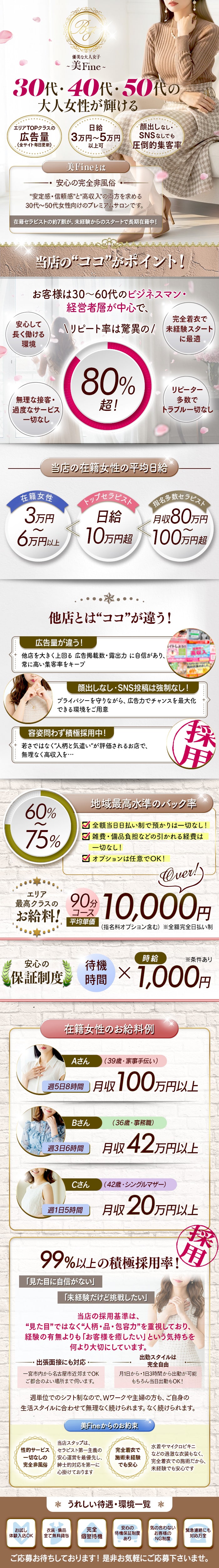 | 応募資格 | 25歳~50代くらいまでの日本人女性 施術研修は、動画を見て学ぶ自主研修も可能♪♪ また、無料実技レッスンもあるので未経験の方や施術に自信がない方はご相談下さい。 ※高校生は不可 ※ご注意※ 当然ですが、風俗行為は一切禁止の『完全健全店』でのお仕事なので、安心して働く事が可能です! |